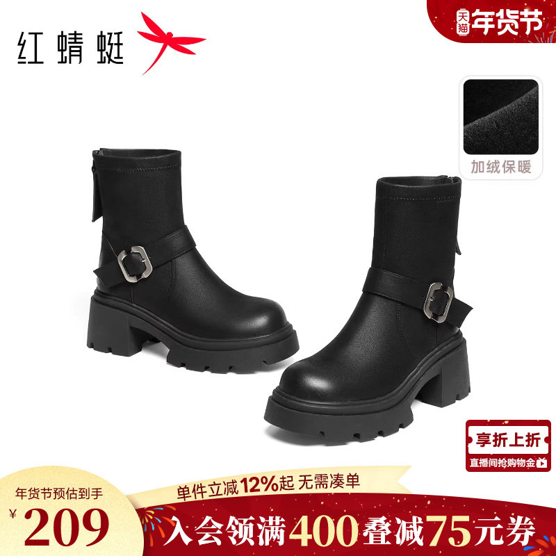 红蜻蜓短靴女冬季新款女靴英伦风厚底增高马丁靴复古黑色中筒靴子
