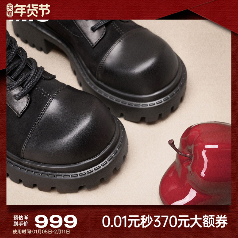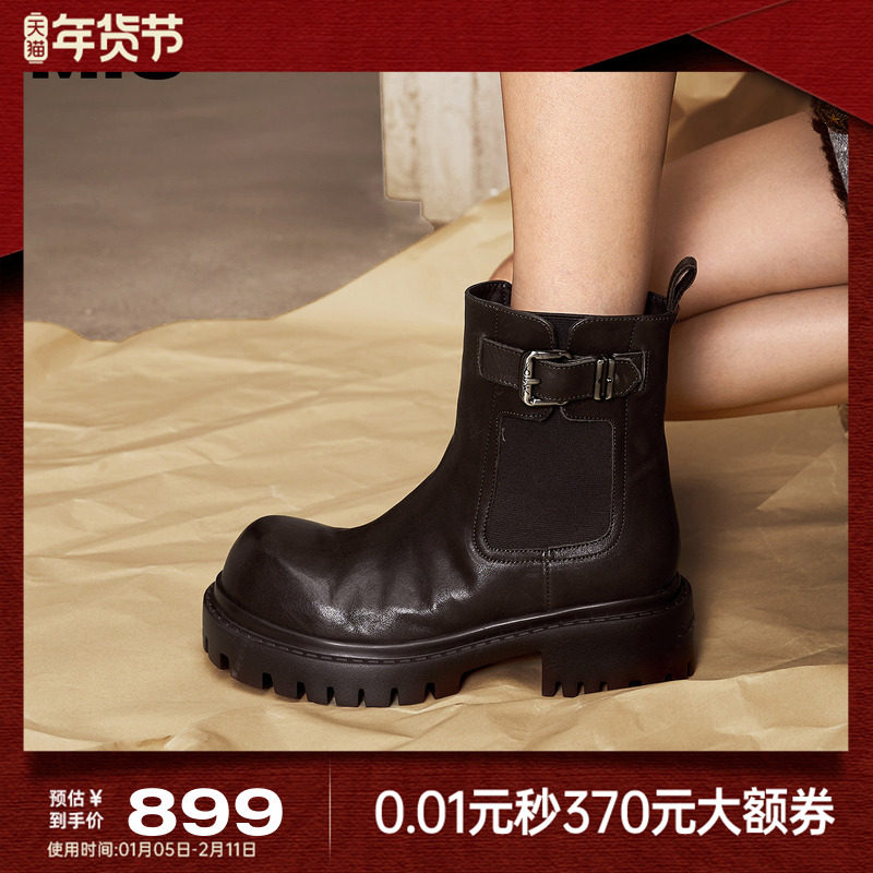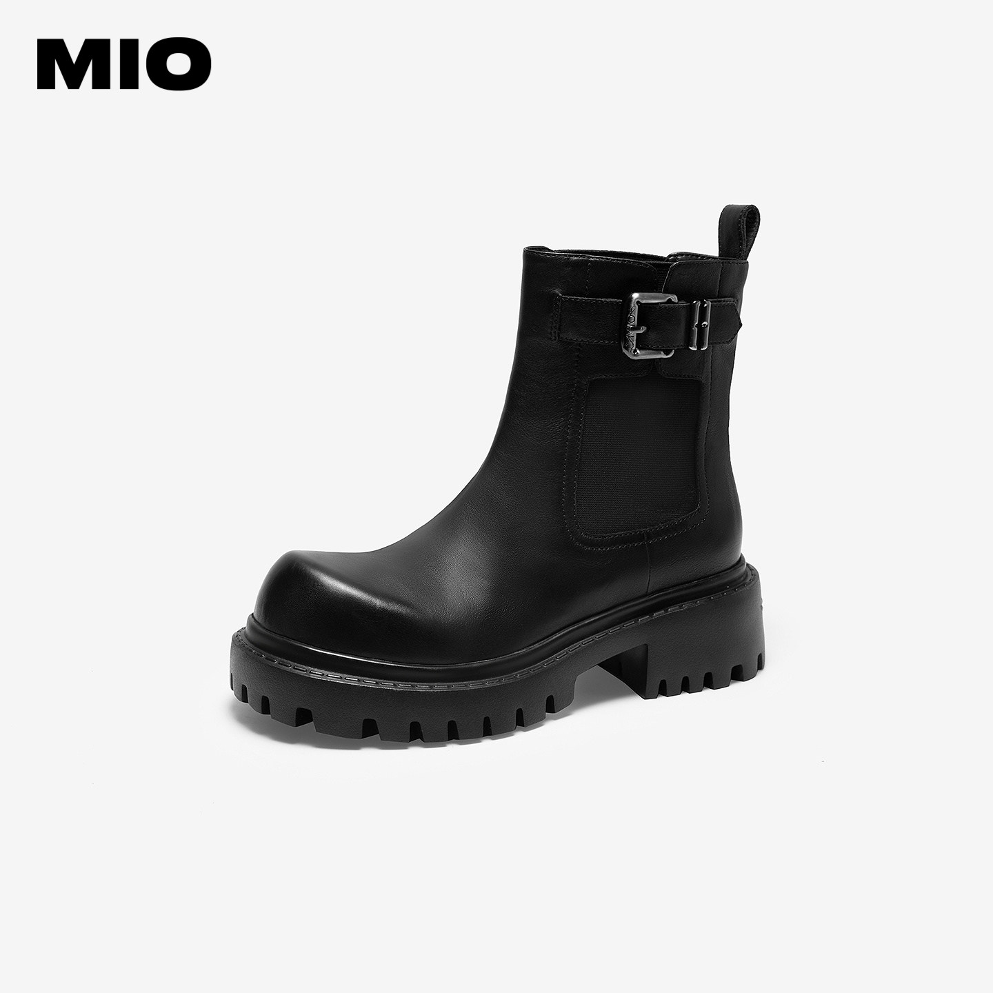 MIO米奥2025冬季新款圆头高跟短筒马丁靴复古扣带厚底增高女靴子