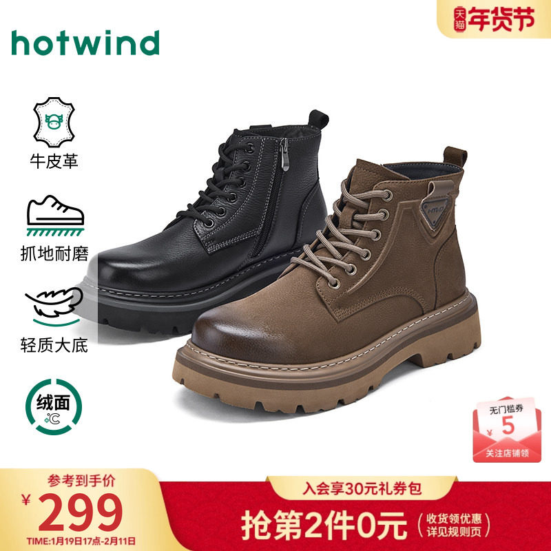 热风男鞋2025年冬季新款男士加绒保暖马丁靴复古百搭厚底休闲靴子