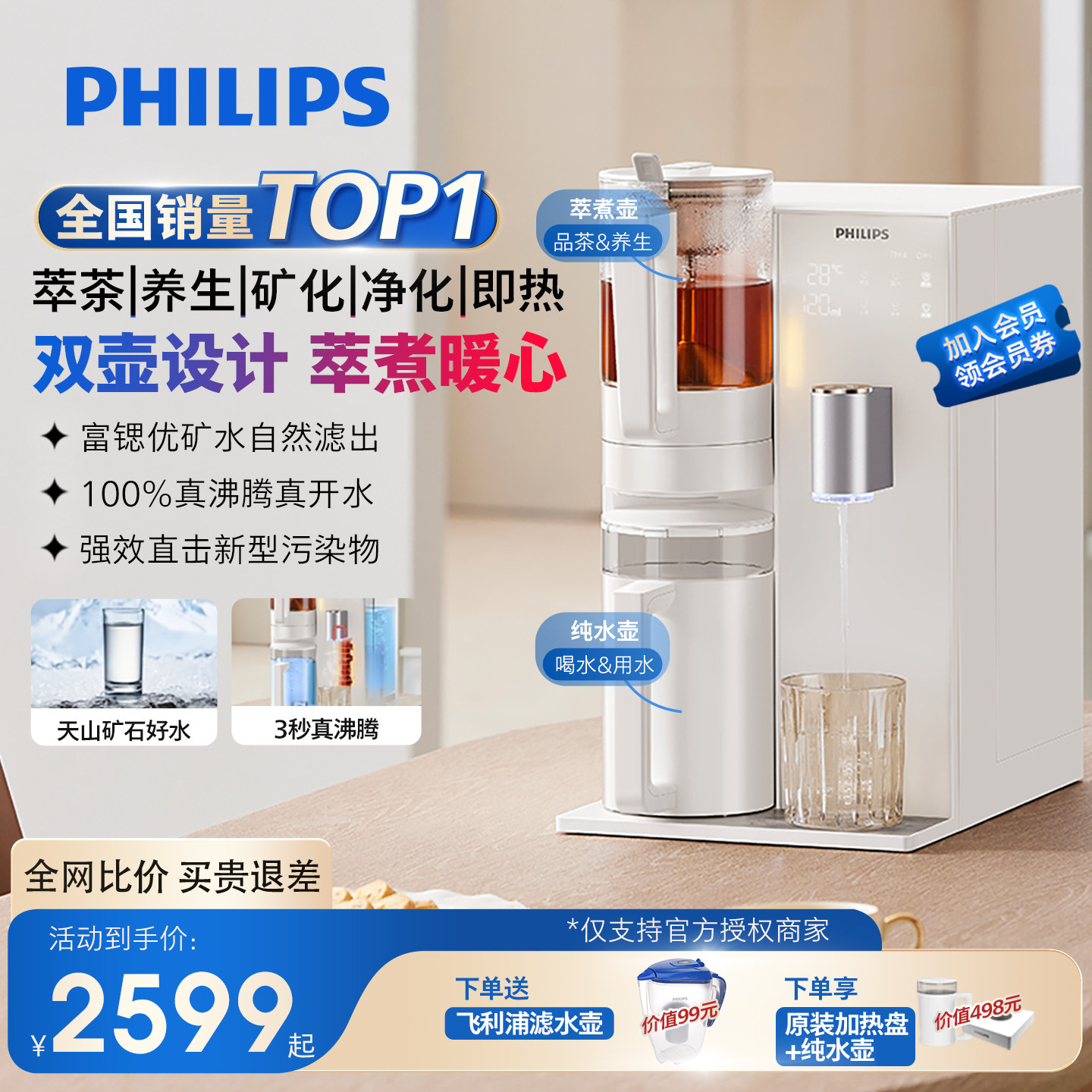 飞利浦矿泉直饮台式免安装净水器家用即热式饮水机加热一体净饮机