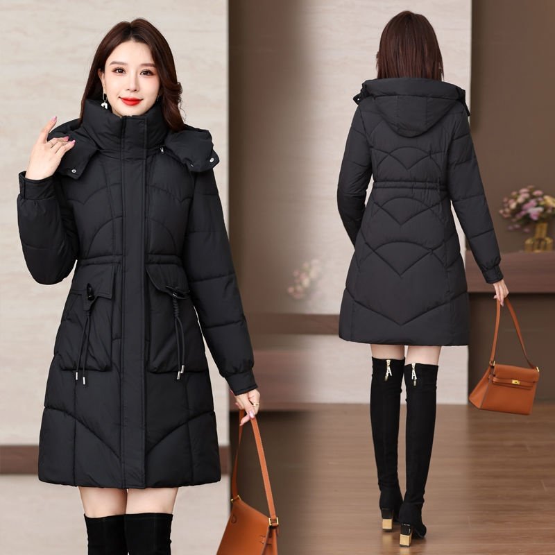 高级感韩版冬装女士保暖外套中长款拉链连帽修身显瘦加厚新款棉服
