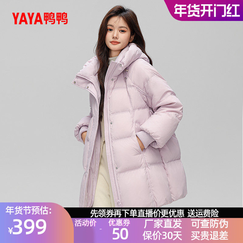 鸭鸭中长款女士羽绒服冬季2025新款连帽冬装韩版休闲保暖羽绒外套