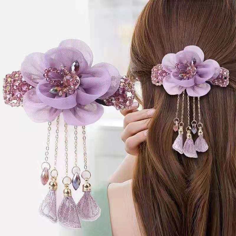 头饰流苏发夹后脑勺花朵顶夹古风发卡韩式发夹复古马尾弹簧夹绢纱