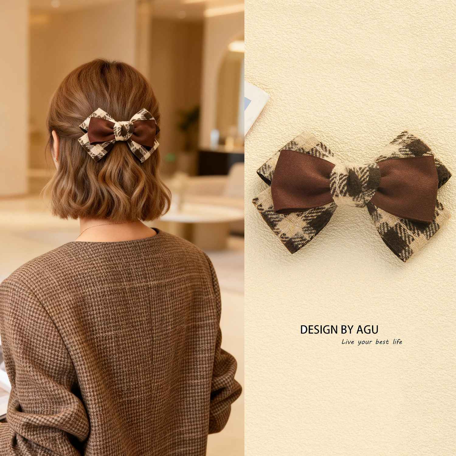 新款高级感格子蝴蝶结发夹女布艺夹子后脑勺弹簧夹半扎发顶夹头饰