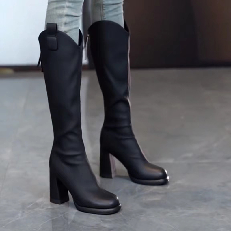 欧美时尚气质长筒靴女2025秋冬新款高跟百搭瘦瘦靴方头粗跟骑士靴