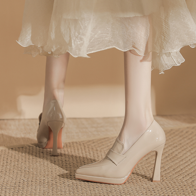 欧美2025年秋季新款深口单鞋真皮粗跟防水台尖头系带米白色高跟鞋