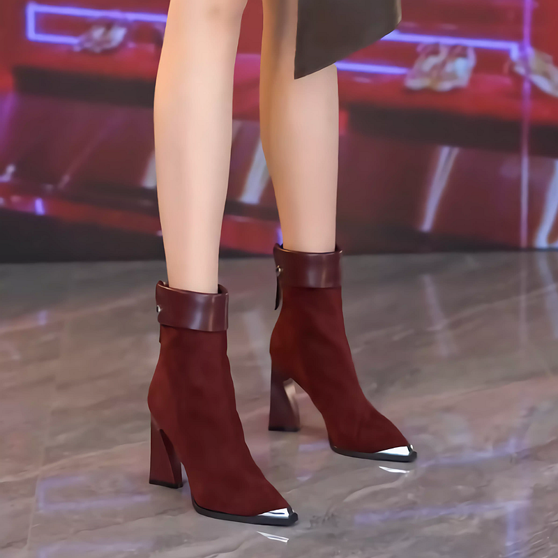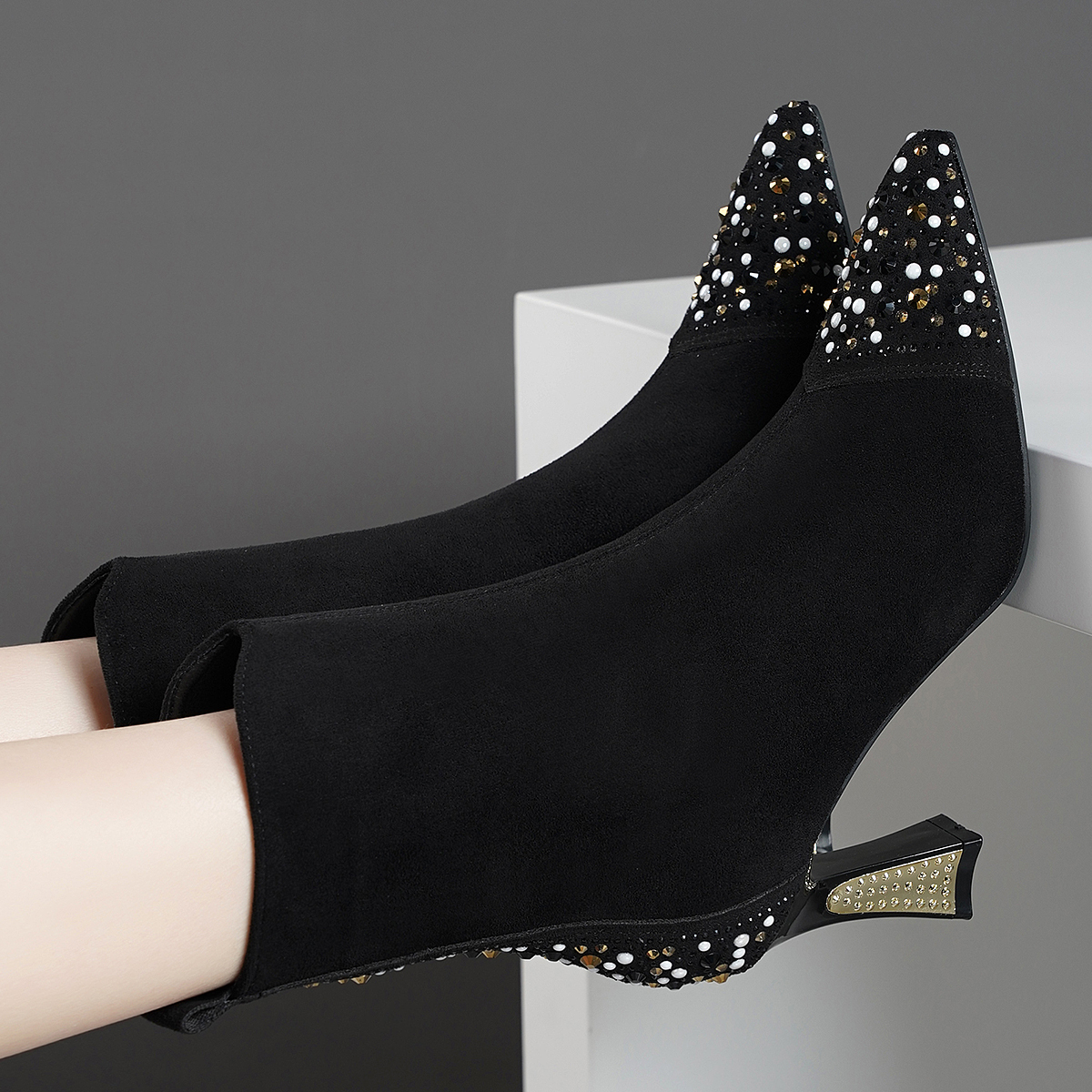 方头短靴女粗跟2025秋冬季新款女靴欧美靴子绒面瘦瘦靴高跟短筒靴