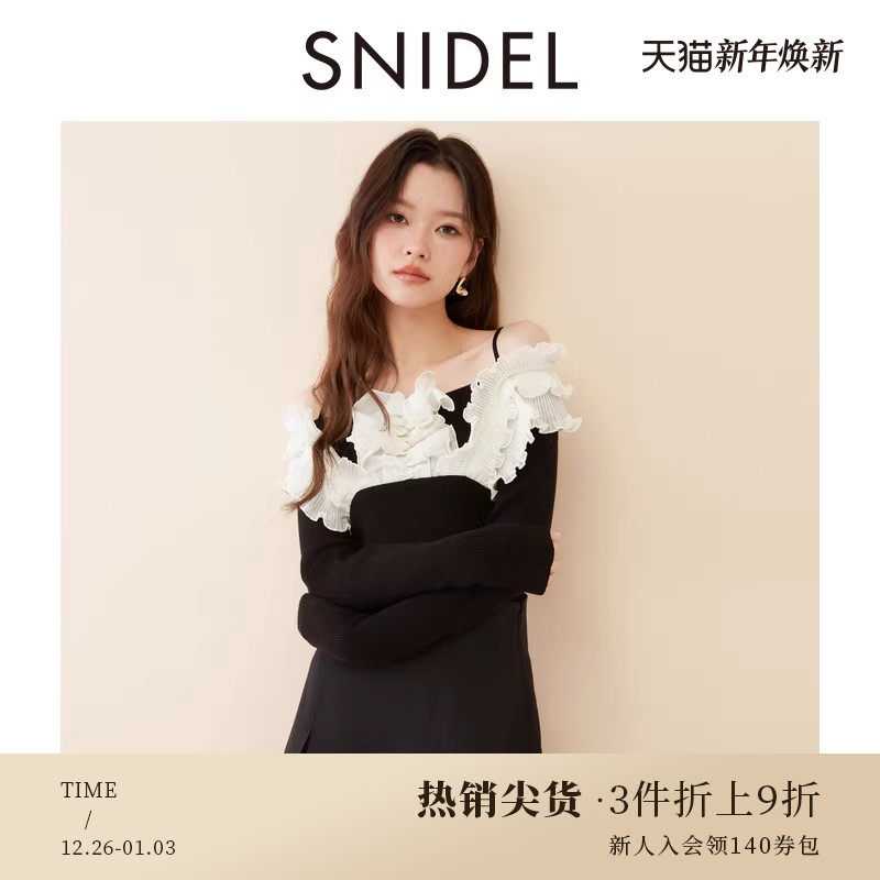 SNIDEL2025春夏新品甜美一字领露肩木耳边针织衫上衣SWNT251092