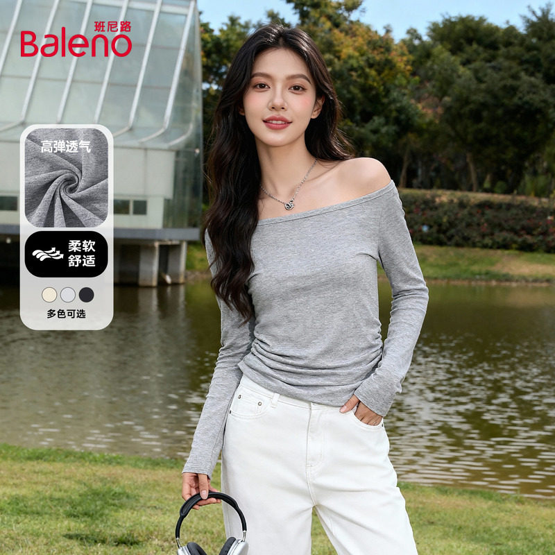 班尼路一字领长袖T恤女2026春夏新款露肩巨好看修身气质内搭上衣Q