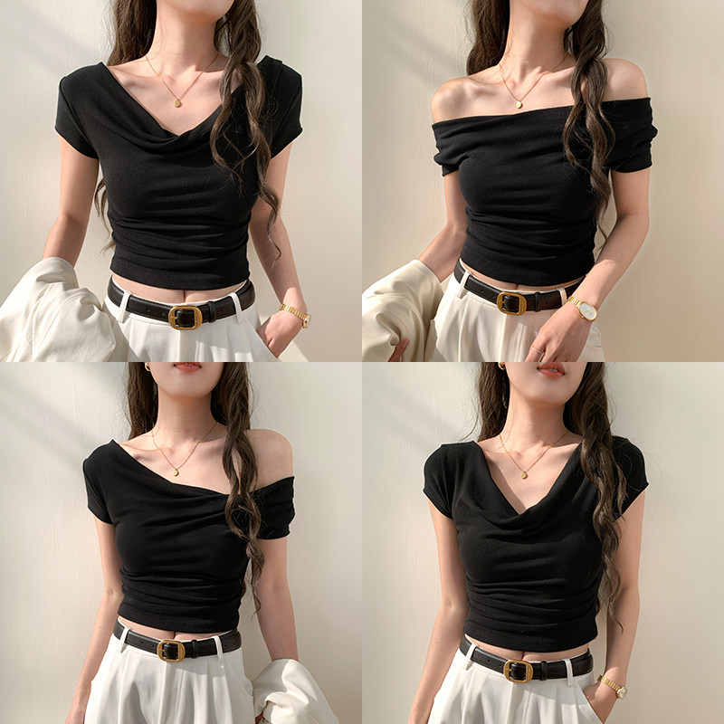 一字领性感露肩短款上衣女显瘦黑色设计感别致绝美辣妹短袖t恤夏