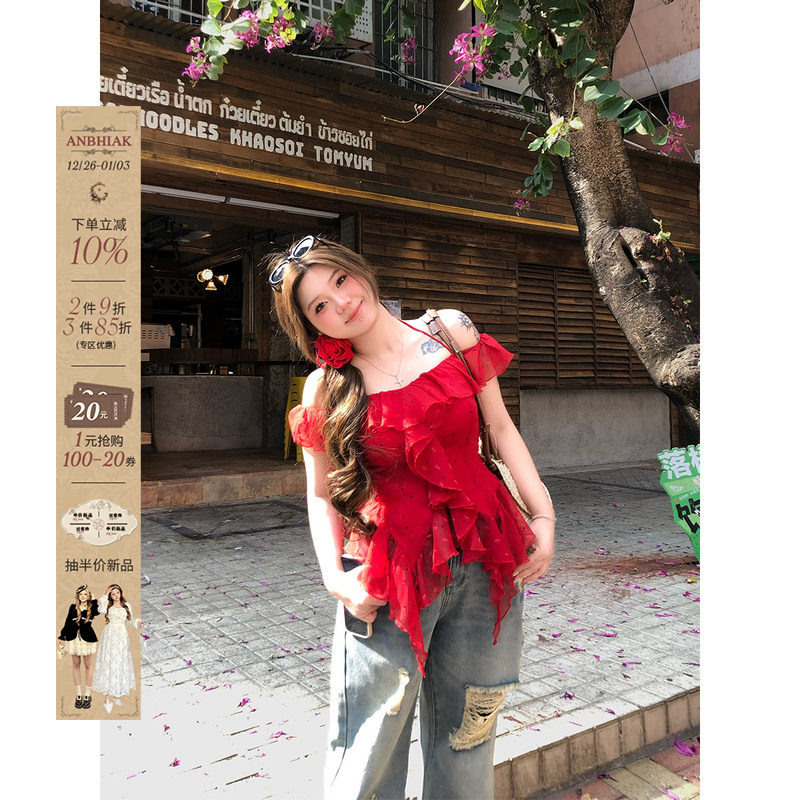 安妮不火一字领荷叶边雪纺上衣女2025夏季新款微胖大码波点雪纺衫