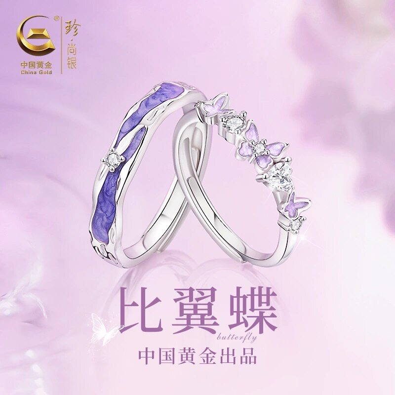 中国黄金央创紫藤花纯银戒指情侣对戒款男生生日礼物送女朋友S925