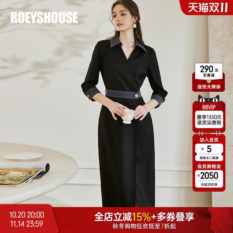 罗衣知性拼接仿牛仔连衣裙2025秋季新款丹宁修身中长裙子09933