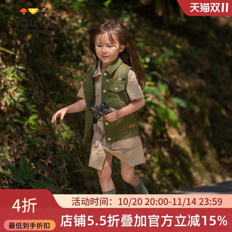 VAUVA墨绿色女童短袖修身牛仔连身裙女宝宝裙子新款女童连衣裙