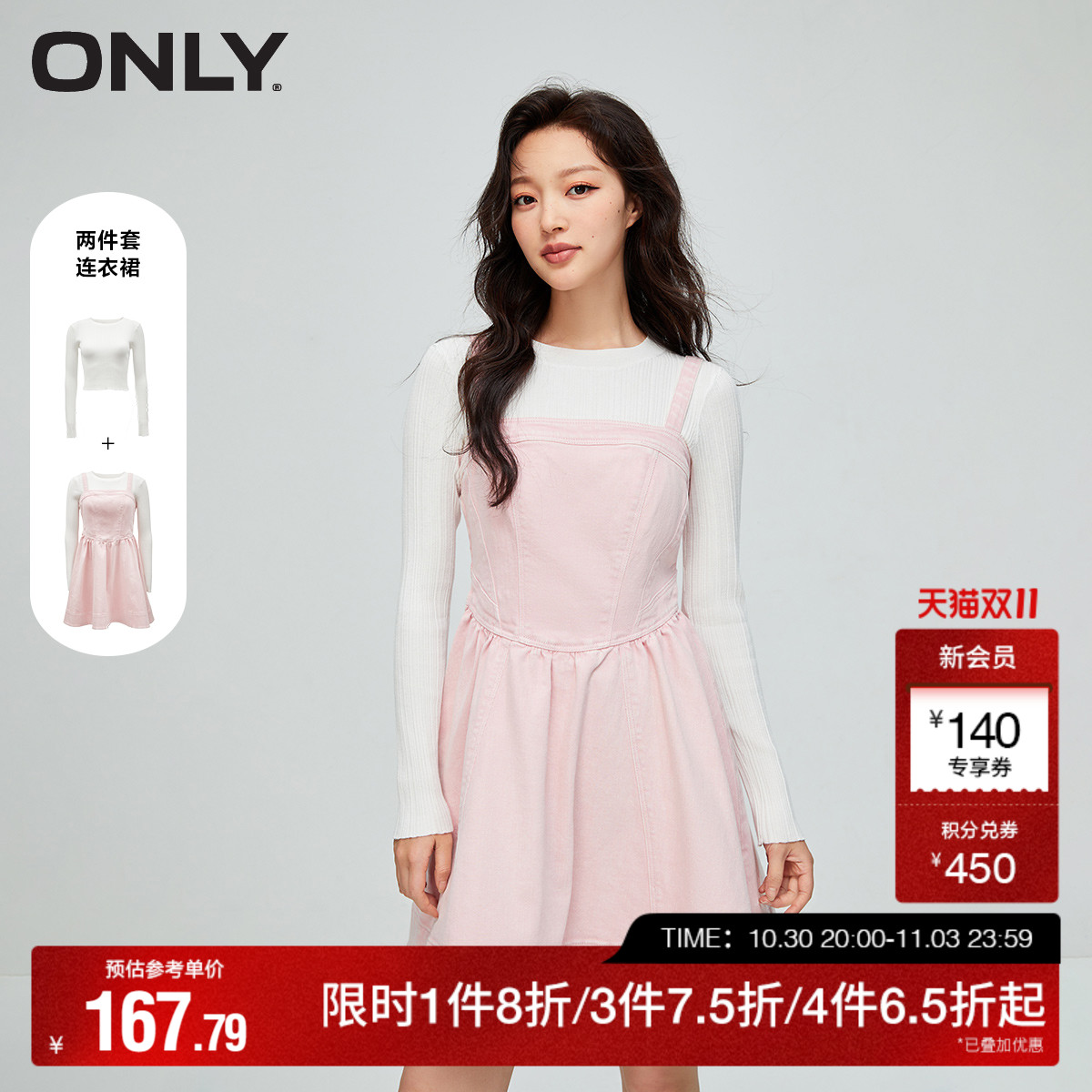 ONLY奥莱2025秋季新款修身针织拼接牛仔裙圆领高腰七分袖连衣裙女