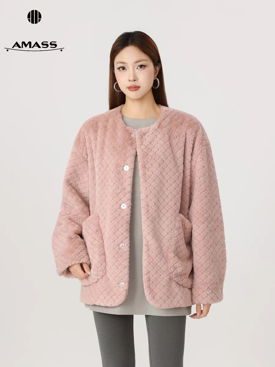 阿玛施专柜女装2025秋冬新款圆领宽松皮草毛绒短外套女5400830