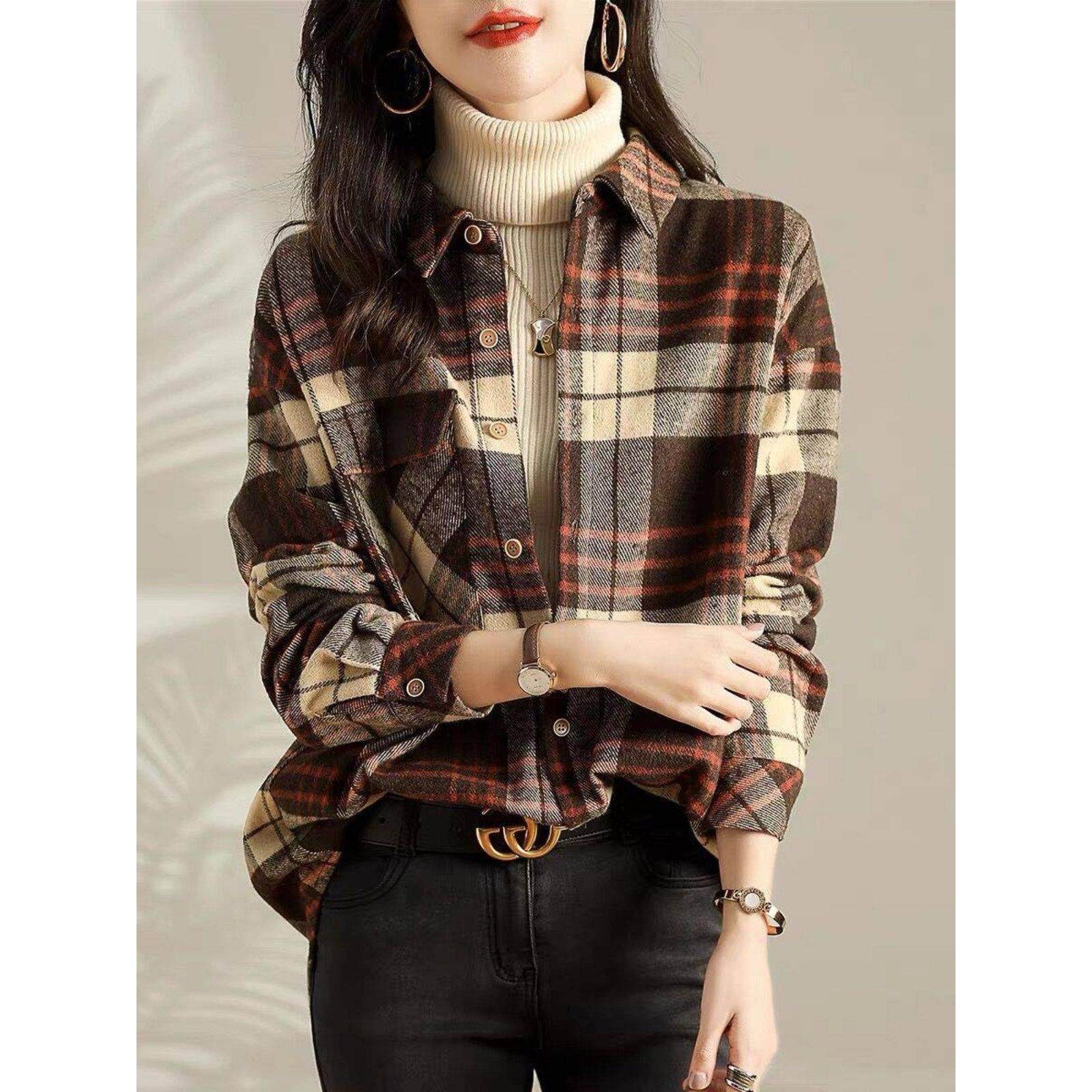 阿玛施女装2025春秋季百搭覆古格子加厚磨毛衬衣宽松休闲衬衫女