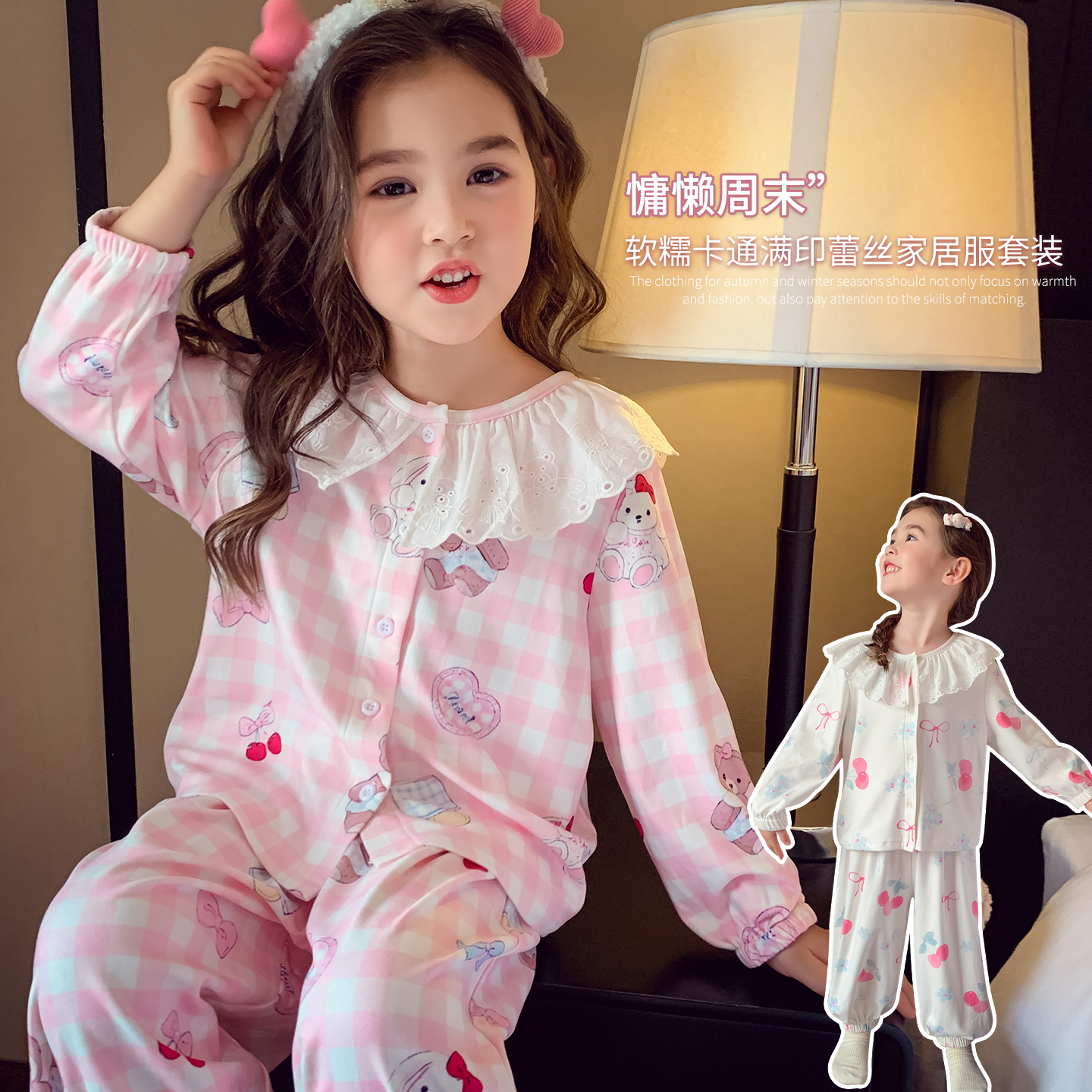 女童家居服套装秋装韩版儿童公主蕾丝长袖睡裤套装女孩睡衣两件套