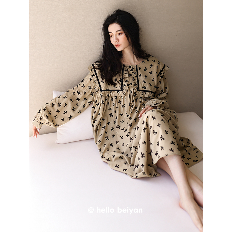 贝妍春秋新款睡衣女甜美公主风莫代尔棉长袖睡裙韩版大码女家居服