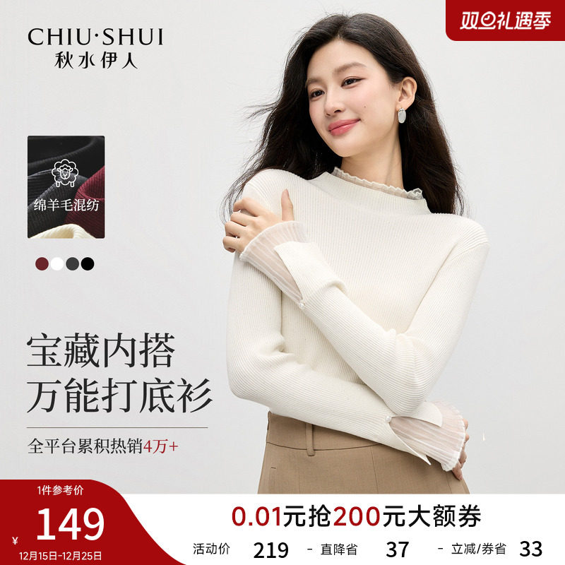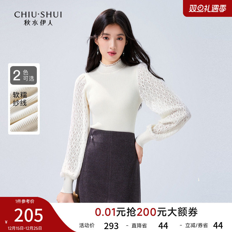 秋水伊人法式优雅蕾丝拼接针织衫2025秋冬新款显瘦半高领打底上衣