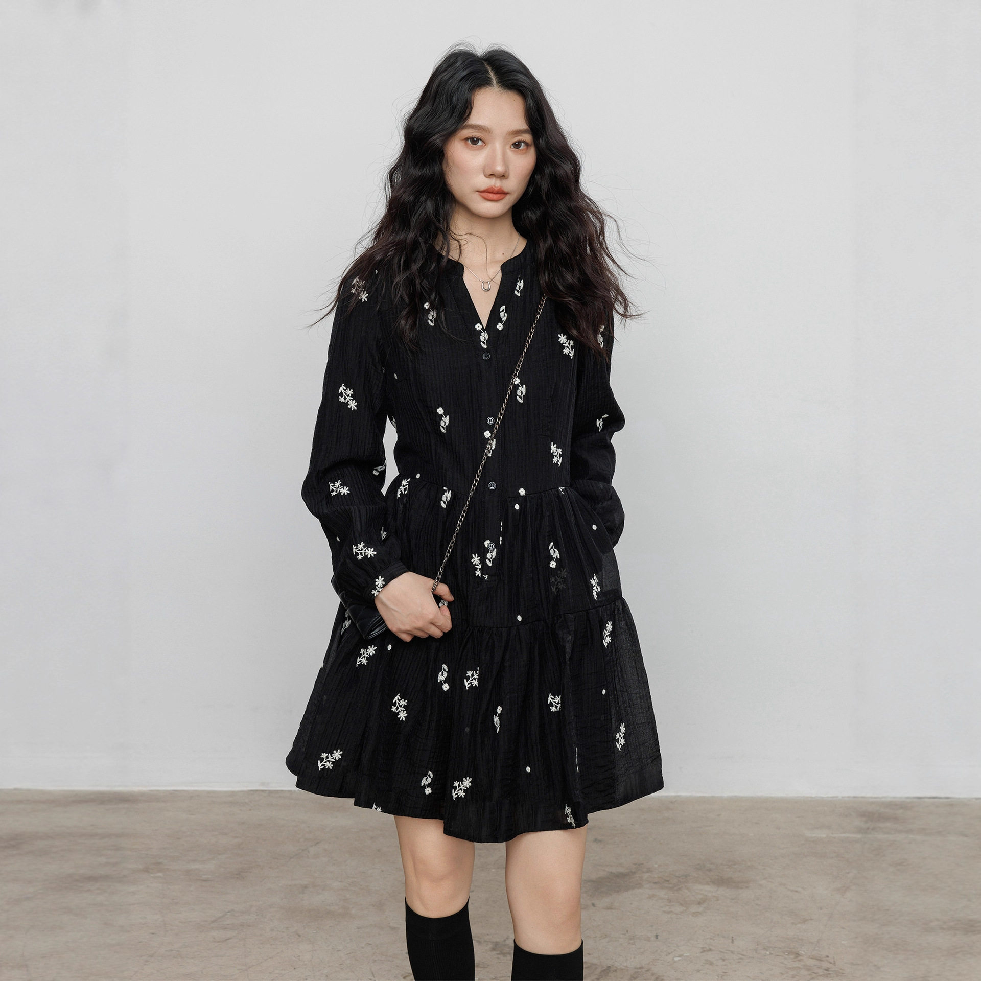 2025秋冬款宽松大码显瘦黑色碎花蛋糕裙长袖复古收腰灯芯绒连衣裙