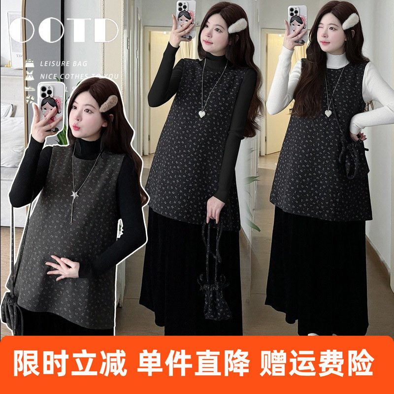 实拍 孕妇装秋冬款背心碎花毛呢连衣裙两件套装咖色单裙黑灰单裙