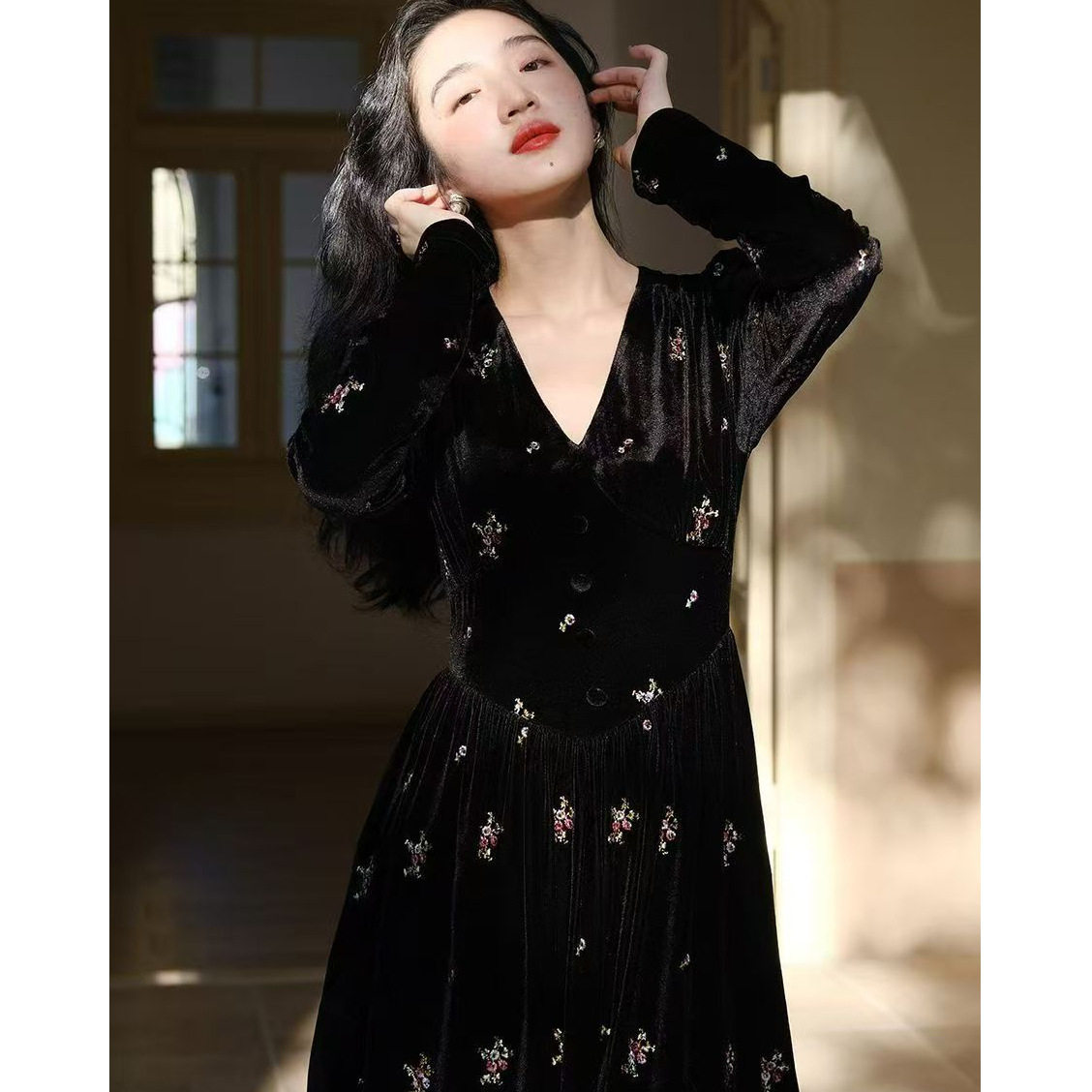 法式碎花黑色丝绒绣丝绒连衣裙2025秋冬款高端显瘦气质性感长裙
