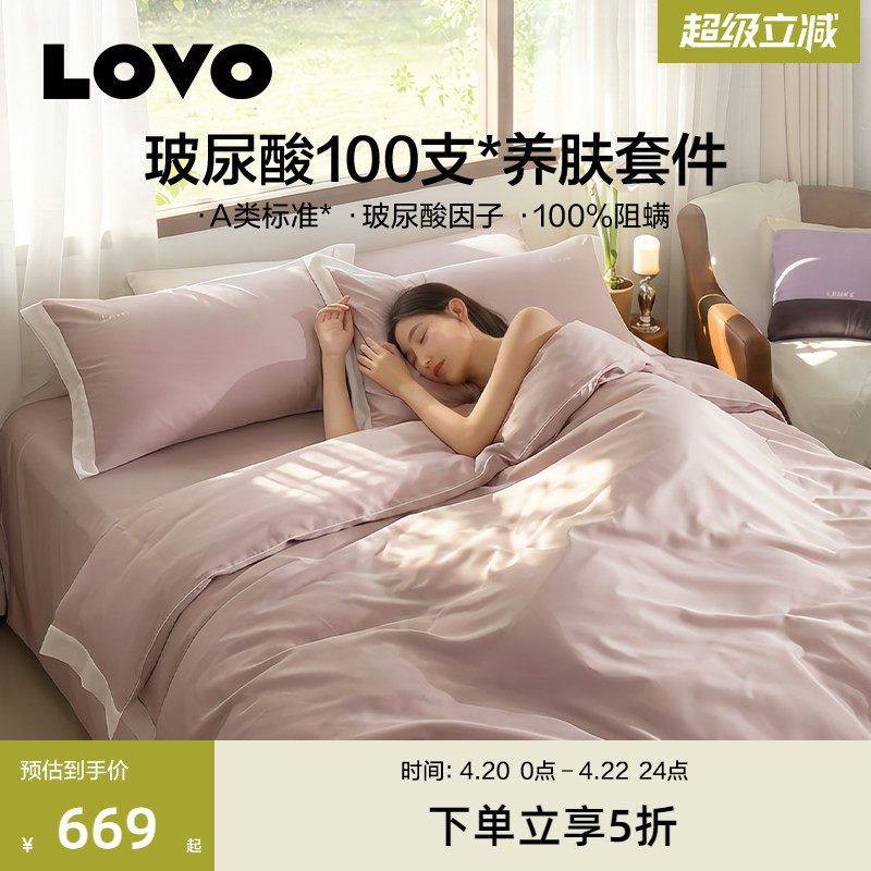 罗莱家纺LOVO100支纯棉长绒棉A类玻尿酸阻螨被套床单全棉四件套