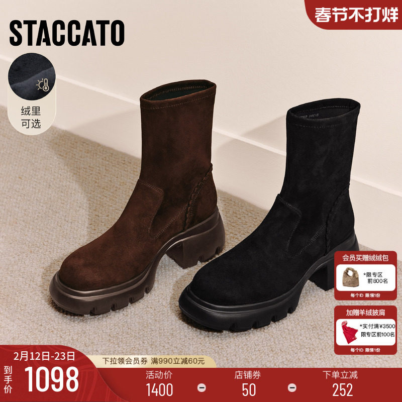 森达弹力瘦瘦靴女2025冬新商场加绒平底厚底增高圆头中筒靴XRP01