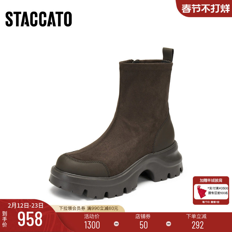 思加图新款百搭弹力靴黑色瘦瘦靴中靴厚底增高加绒女靴子Y2563DZ5