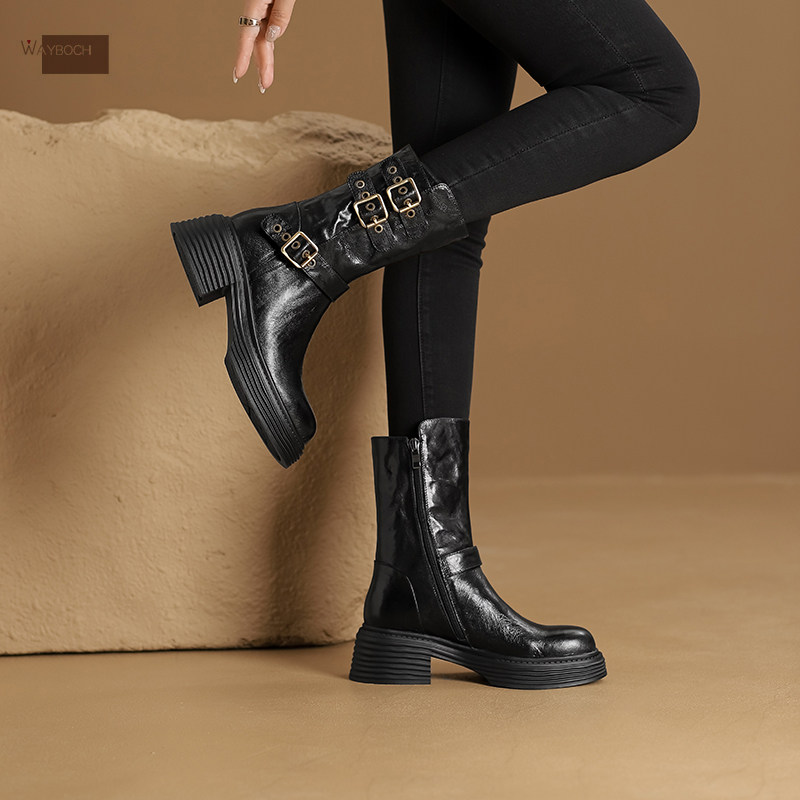 真皮手抓纹羊皮中筒休闲机车靴 厚底防水台中靴女 粗跟皮带扣褶皱