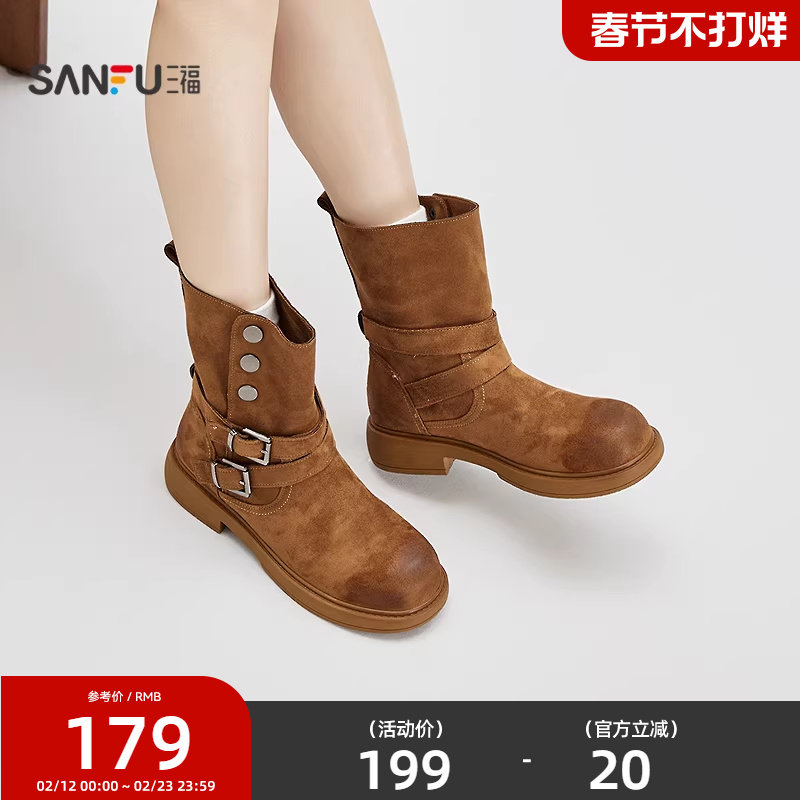 三福中靴女冬季都市游牧风中筒靴侧双扣装饰西部靴女鞋849391