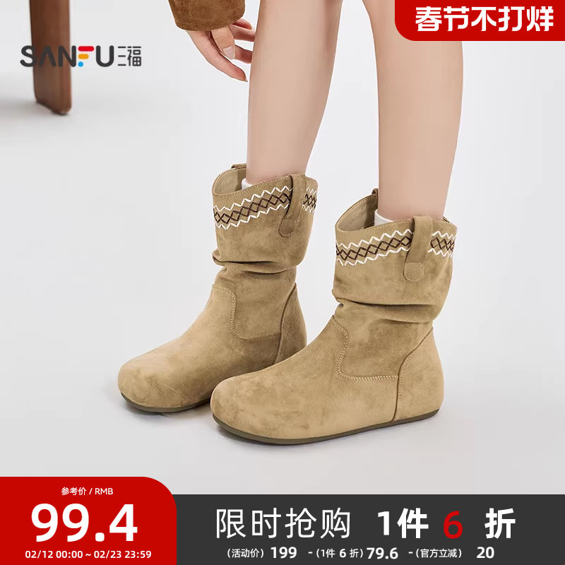 三福女中靴冬季都市游牧靴口民族绣线堆堆靴圆头女鞋850413