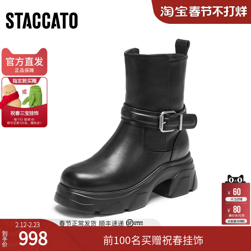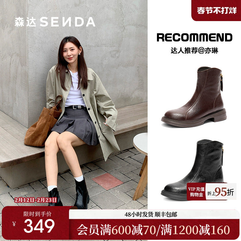 森达真皮马丁靴女冬款商场同款时尚英伦绒里厚底工装中筒靴XEC01
