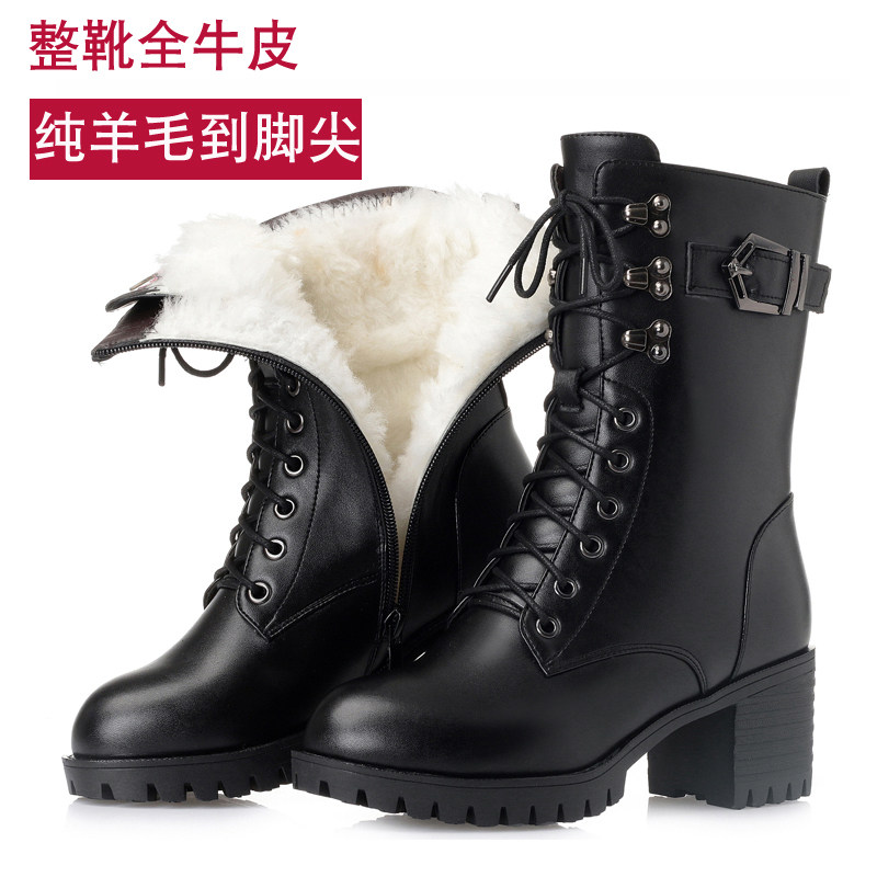 马丁靴女鞋真皮羊毛中靴女棉鞋粗跟厚底中筒靴中跟加绒棉皮靴女靴