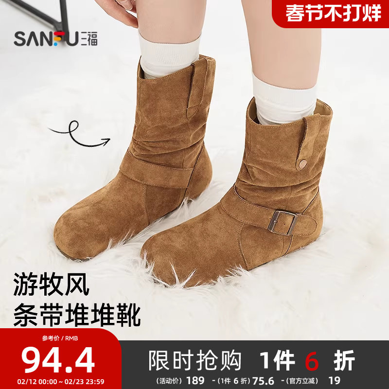 三福女中靴冬季都市游牧风双耳朵褶皱一字带堆堆靴女鞋846810