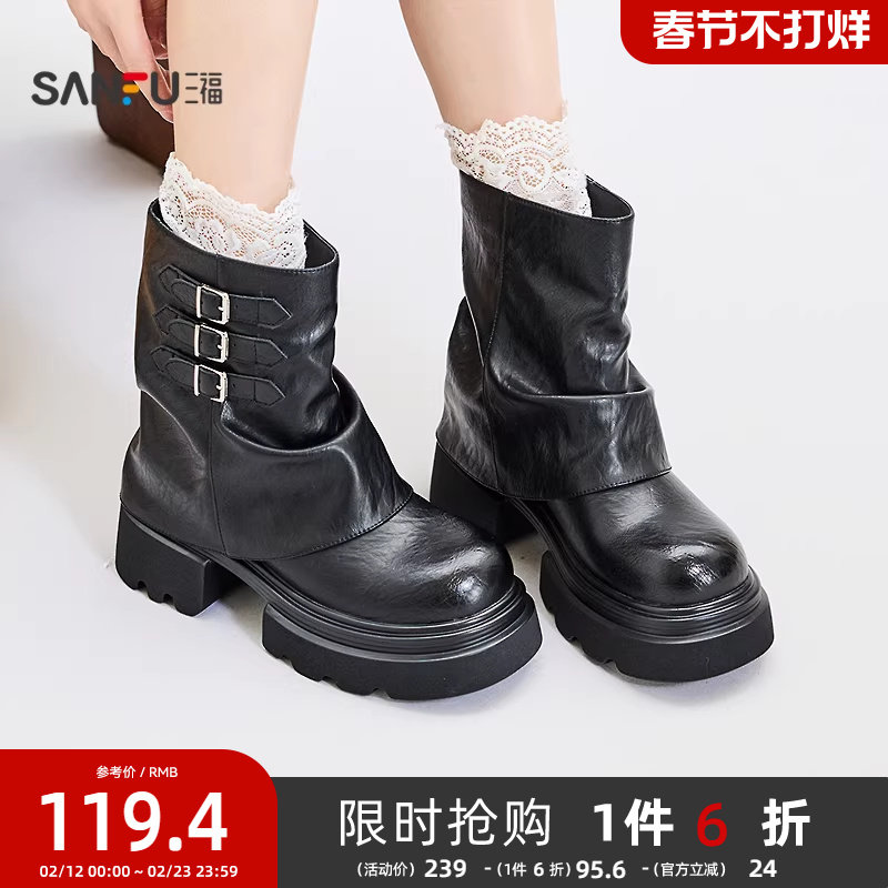 三福女中靴冬季都市游牧风侧边扣带朋克风厚底翻筒靴女鞋848166