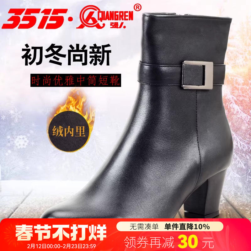 强人3515高跟单靴加绒中靴女靴秋冬新款时尚真皮女靴黑色高帮女靴