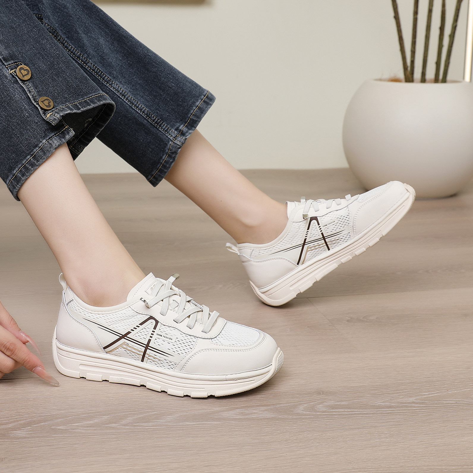 真皮女鞋新款2026新款夏季网面透气运动休闲小皮鞋平底旅游跑步鞋
