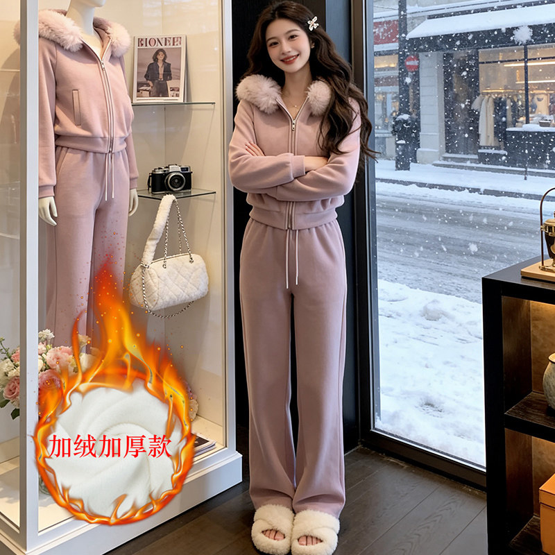 秋冬加绒加厚保暖连帽外套高腰直筒休闲裤气质潮流运动时尚套装女