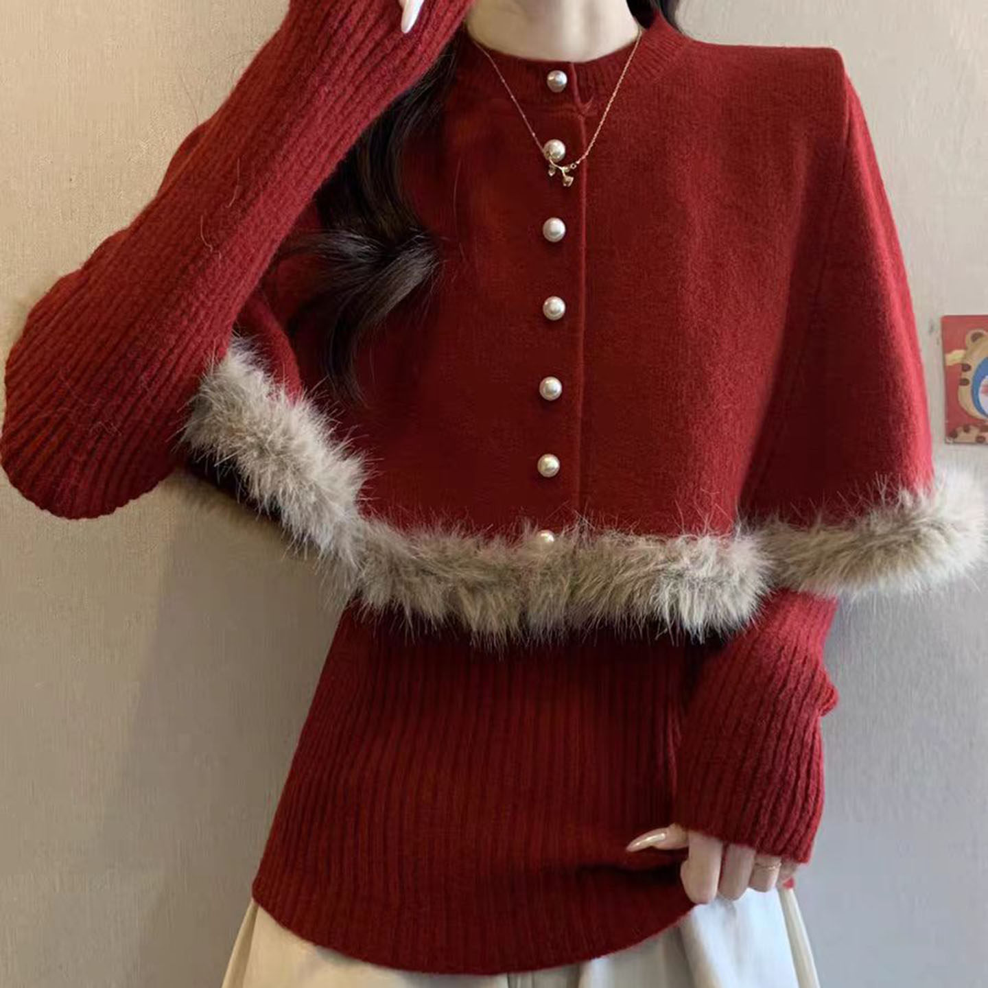 冬季圣诞新年氛围感毛边斗篷披肩毛衣针织衫女时尚气质百搭套装潮