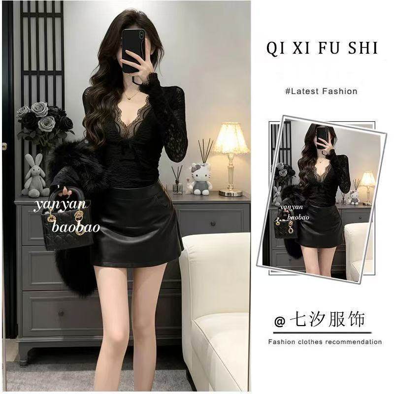 秋冬气质御姐慵懒风宽松套头毛衣配高腰拉链皮裙时尚两件套装女潮