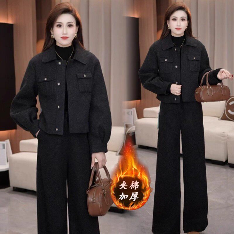 时尚休闲套装女2025秋冬新款气质高级感加厚短外套阔腿裤两件套潮
