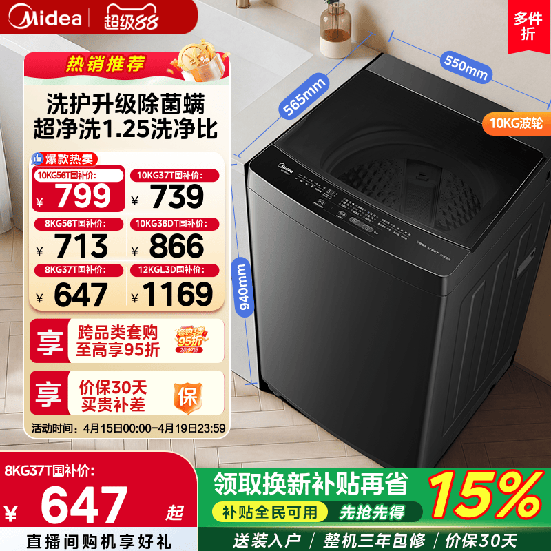 [全民补贴]美的12/10/8kg全自动家用大容量出租房用波轮洗衣机