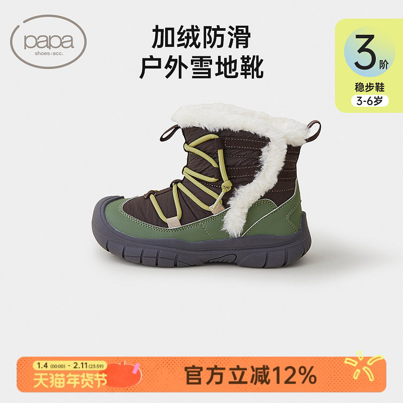 papa爬爬儿童短靴棉鞋设计感冬季系带加绒保暖户外男女宝宝雪地靴