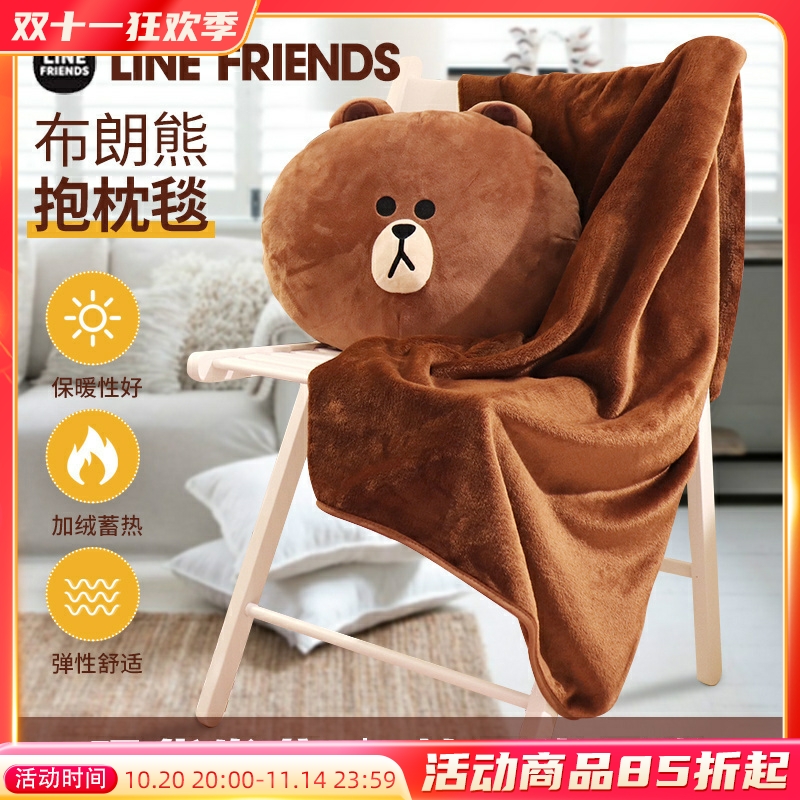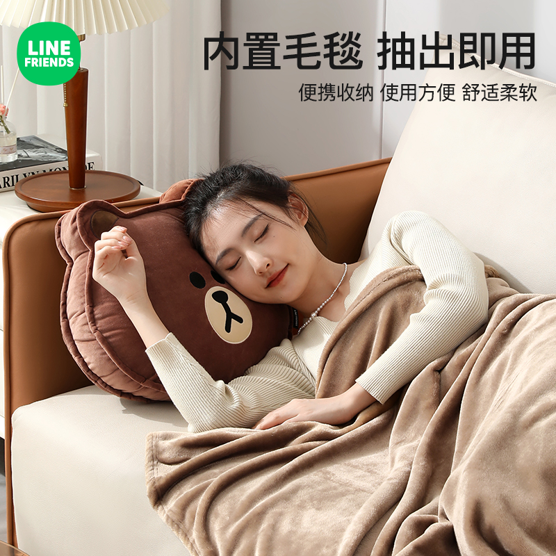 line布朗熊卡通毛绒抱枕办公汽车靠枕午休家用女保暖毛毯空调毯子