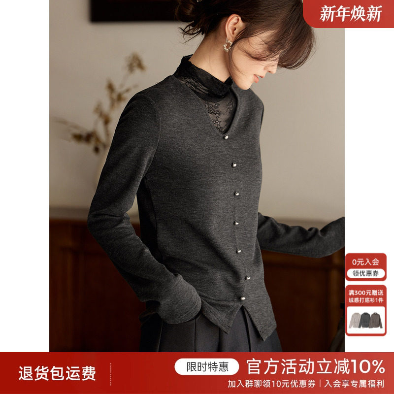 XWI欣未法式V领蕾丝拼接堆堆领打底衫女秋冬季假两件别致修身T恤