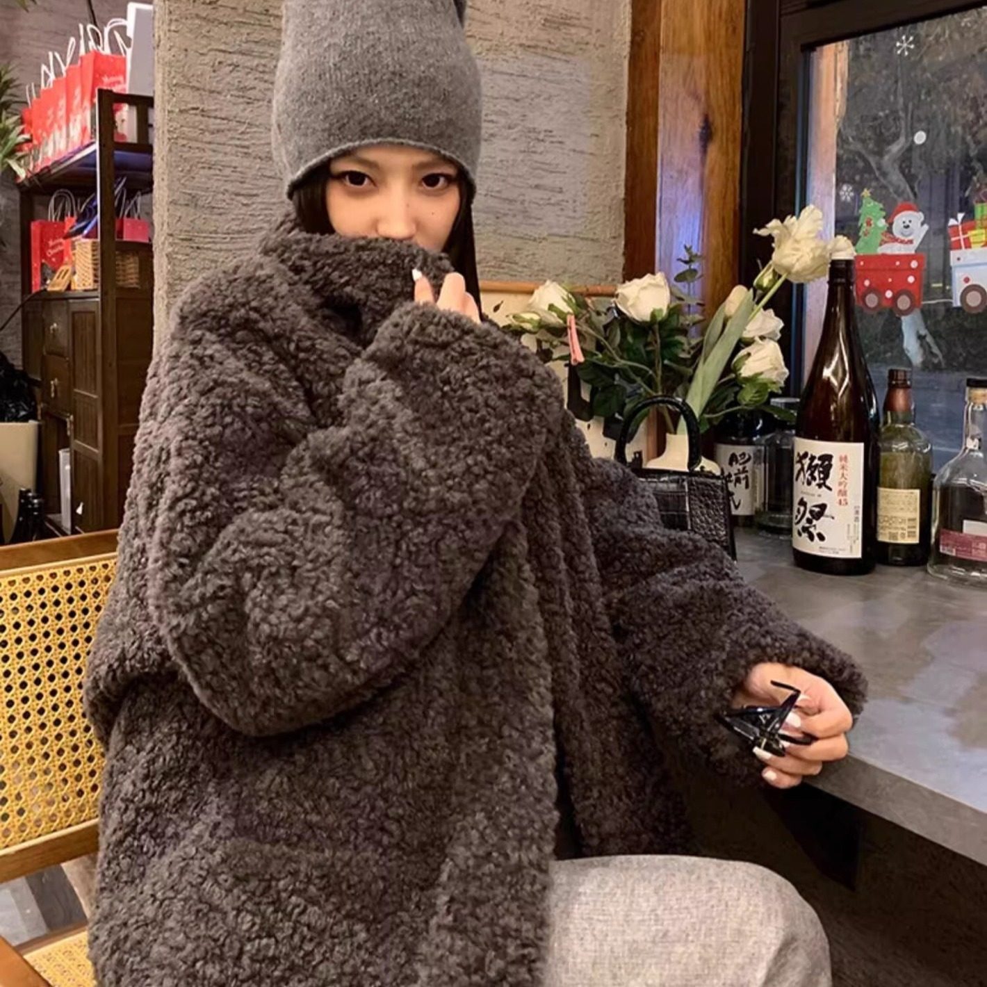 毛茸茸!辣妹羊羔毛宽松OVERSIZE立领中长款毛毛外套大衣女