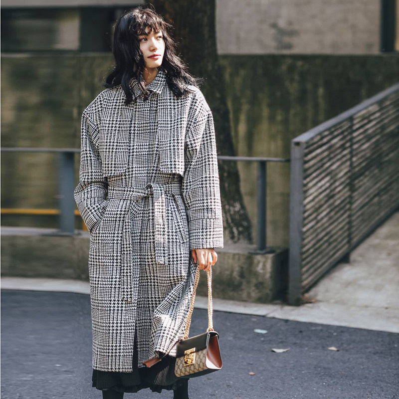 秋冬复古黑白千鸟格收腰系带oversize毛呢大衣宽松显瘦长款外套