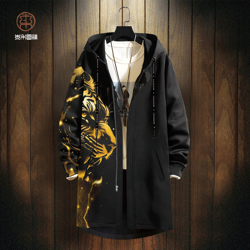 连帽风衣男士ins国潮老虎头印花中长款开衫外套oversize加厚大衣